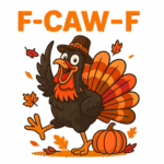 Rocking a pilgrim-style hat, flapping wings, flying leaves, and bold F-CAW-F lettering, this design captures the exact moment fall vibes turn into loud, happy chaos.